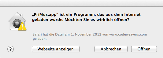 Hinweis 2: Sollte sich das Programmfenster nicht öffnen sondern nur ein PriMus-Symbol im Dock erscheinen, dann starten Sie das Programm durch einen Klick auf dieses Symbol.