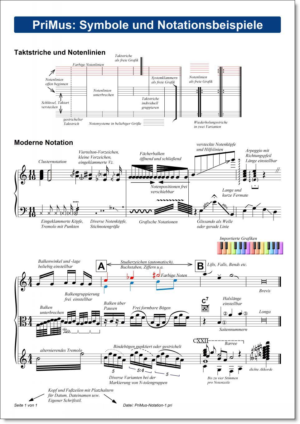 Die Notationsmöglichkeiten von PriMus sind beeindruckend vielfältig und flexibel. Einen Eindruck davon erhalten Sie, wenn Sie sich das nebenstehende Beispielblatt anschauen. Klicken Sie es an, um es in groß anzusehen oder laden Sie es als PDF-Datei herunter und drucken es bei sich in voller Qualität aus.(Download des PDF mit Rechtsklick und 'Speichern unter...')